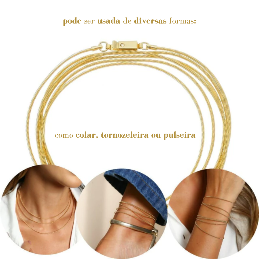 Possui 1,20 metro de comprimento, o que permite diferentes formas de uso: enrolada várias vezes no pulso para um visual moderno, ou como choker minimalista, perfeita para sobrepor com outras peças.
